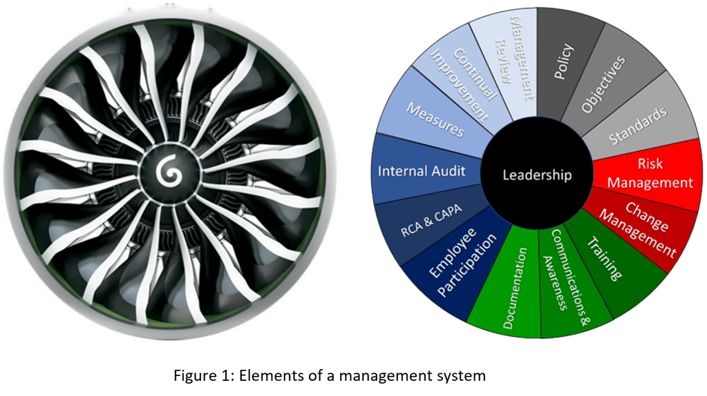 To understand how these different elements of a management system work together, imagine the fan section of an aircraft’s turbofan engine (shown in Figure 1). The fan has two main components, the hub and the blades. All of these components perform specific jobs and are indispensable. The hub’s function is to hold all of blades together in the fan and to impart energy and motion to the blades. Without the hub, the fan blades would be useless. Using the energy and motion of the hub, the blades provide the force that moves air through the engine and propels the aircraft. All of the blades are important. If one is missing or damaged, the fan will be out of balance, which would have a catastrophic effect ripping the fan and engine apart.
